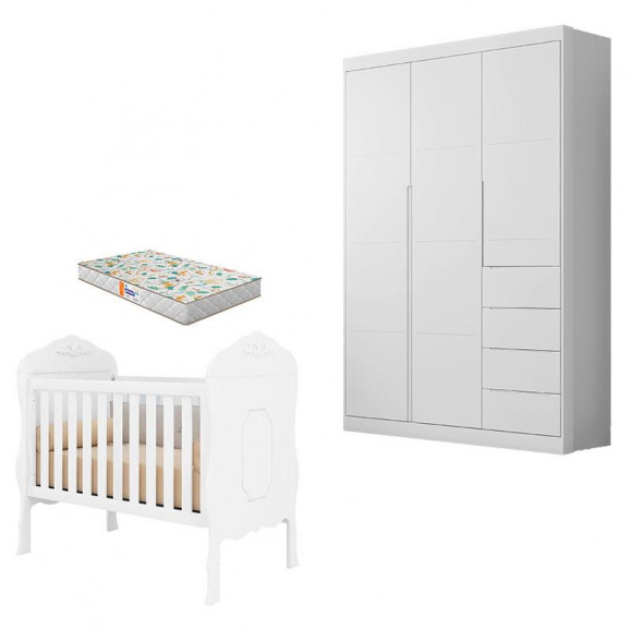 Berço Americano Realeza e Guarda Roupa Infantil Eloá Branco Acetinado com Colchão Gazin - Phoenix Baby