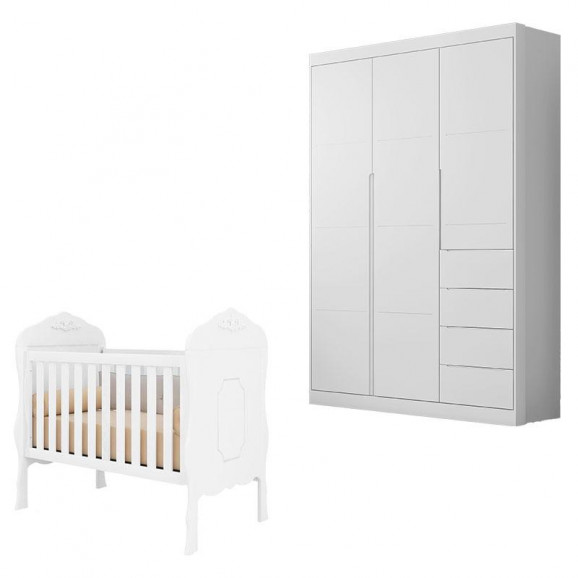 Berço Americano Realeza e Guarda Roupa Infantil Eloá Branco Acetinado - Phoenix Baby