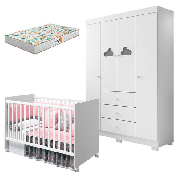 Berço Americano Tico e Guarda Roupa Infantil Ane Branco Brilho com Colchão Gazin – Phoenix Baby