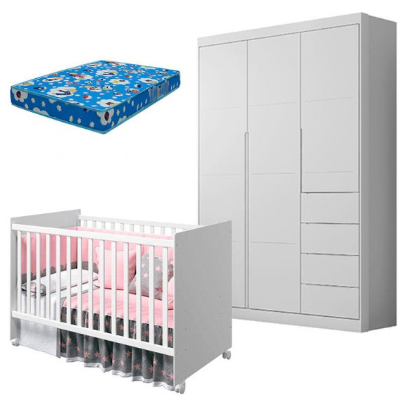 Berço Americano Tico e Guarda Roupa Infantil Eloá Branco Acetinado com Colchão Ortobom – Phoenix Baby