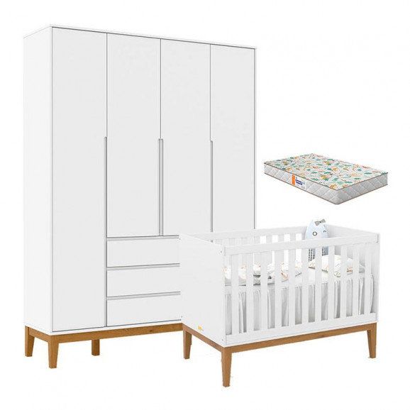 Berço Americano Unique e Guarda Roupa 4 Portas Nature Clean Branco Soft Eco Wood com Colchão Gazin – Matic