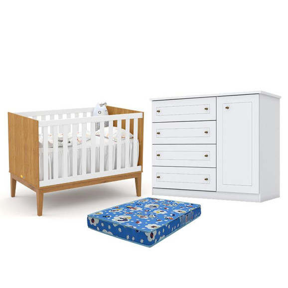 Conjunto infantil composto por Berço Americano Unique Freijó Branco Soft Eco Wood Matic e Cômoda Infantil Americano Branco HP Henn. O berço apresenta design moderno com acabamento Soft Eco Wood e detalhes em Freijó, estrutura resistente e estrado com regulagem de altura, garantindo conforto e segurança para o bebê. A cômoda oferece ótimo espaço para organização de roupas e acessórios, com visual clean e fácil de combinar. Ideal para compor um quarto de bebê funcional, elegante e aconchegante. Acompanha Colchão TendTudo.