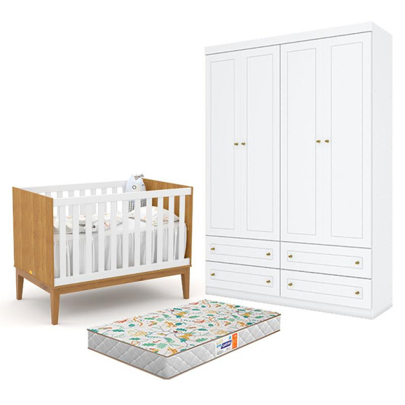 Berço Americano Unique Freijó Branco Soft Eco Wood - Matic e Guarda Roupa Infantil Americano 4 Porta Branco HP com Colchão Gazin - Henn