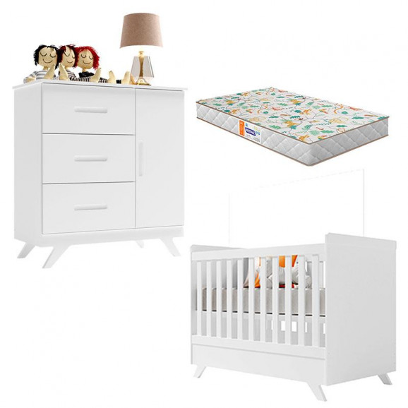Berço Americano Vitória e Cômoda Retro Maya Branco Acetinado com Colchão Gazin – Canaã