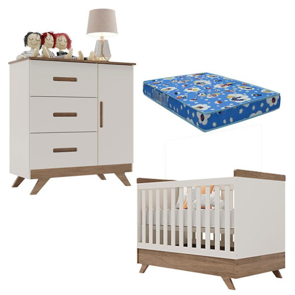 Berço Americano Vitória e Cômoda Retro Maya Off White Carvalho com Colchão Ortobom – Carolina