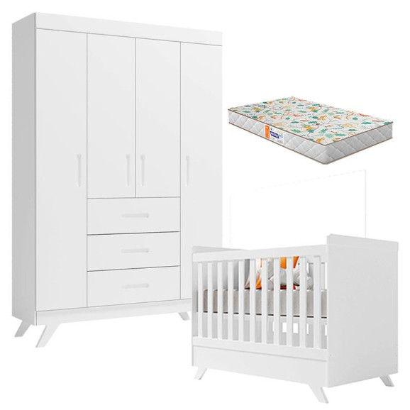 Berço Americano Vitória e Guarda Roupa Retro Maya Branco Acetinado e Colchão Gazin – Canaã