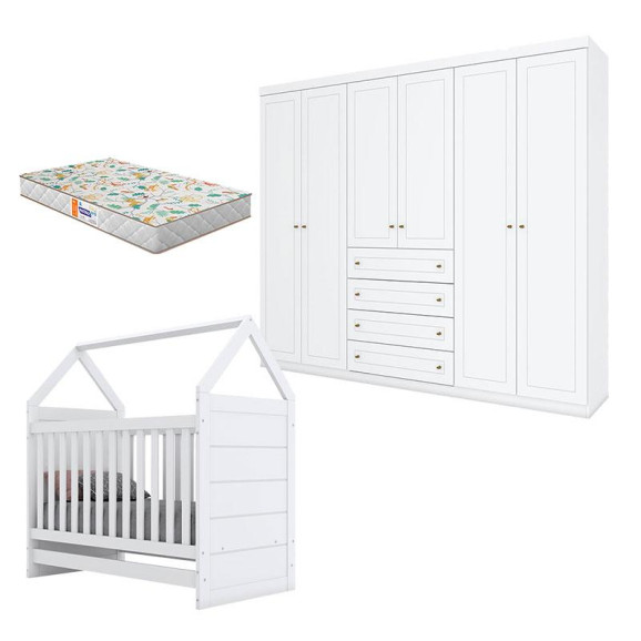 Berço Montessoriano e Guarda Roupa Infantil Americano 6 Portas Branco HP com Colchão Gazin - Henn