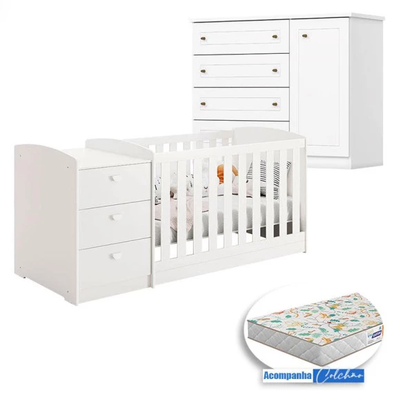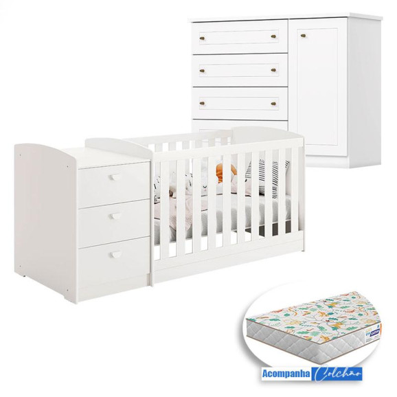 Berço Multifuncional Atlanta e Cômoda Infantil Mississipi Henn Branco Fosco com Colchão Gazin - Reller