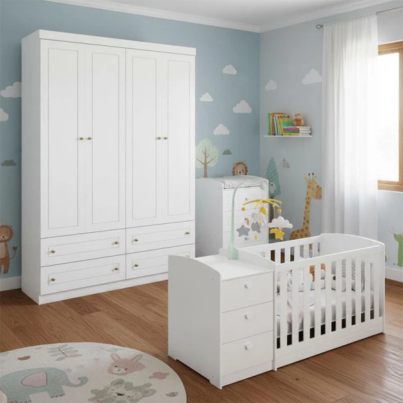 Berço Multifuncional Atlanta e Guarda Roupa 4 Portas Americano Ambiente Branco Fosco Henn - Reller