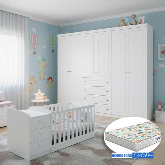 Berço Multifuncional Atlanta e Guarda Roupa 6 Portas Americano Ambiente Branco Fosco Henn com Colchão Gazin - Reller