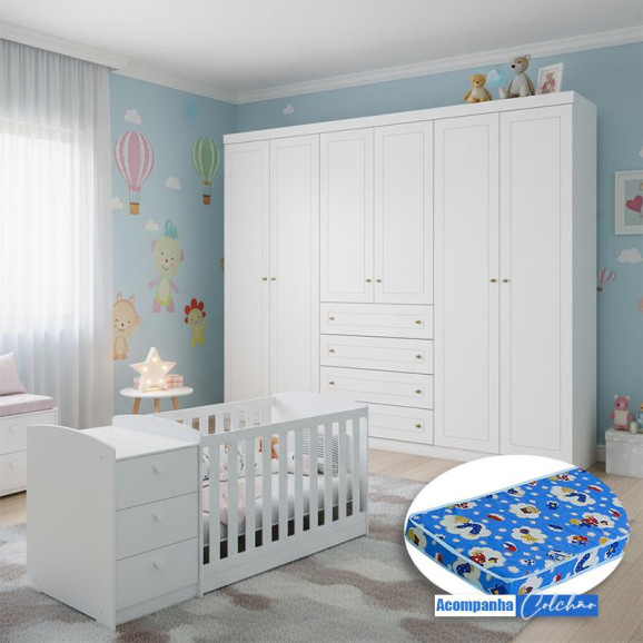 Berço Multifuncional Atlanta e Guarda Roupa 6 Portas Americano Ambiente Branco Fosco Henn com Colchão Ortobom - Reller
