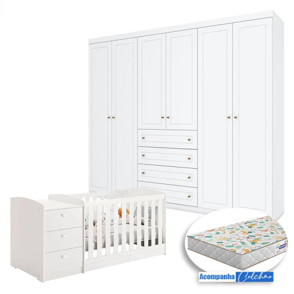 Berço Multifuncional Atlanta e Guarda Roupa 6 Portas Americano Branco Fosco Henn com Colchão Gazin - Reller