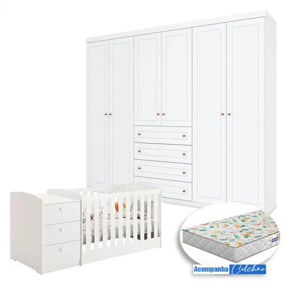 Berço Multifuncional Atlanta e Guarda Roupa 6 Portas Mississipi Branco Fosco Henn com Colchão Gazin - Reller