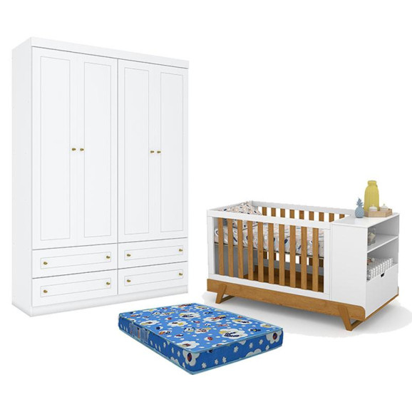 Berço Multifuncional Bkids Branco Freijó Eco Wood - Matic e Guarda Roupa Infantil Americano 4 Porta Branco HP com Colchão Ortobom - Henn