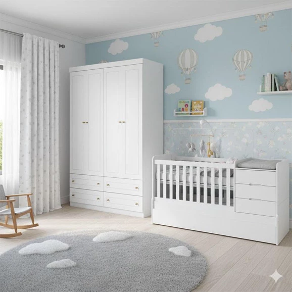 Berço Multifuncional Cleo e Guarda Roupa Infantil 4 Portas Mississipi Ambiente Branco Fosco com Colchão Ortobom - Henn