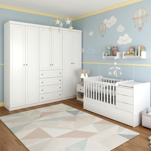 Berço Multifuncional Cleo e Guarda Roupa Infantil 6 Portas Mississipi Ambiente Branco Fosco com Colchão Gazin - Henn