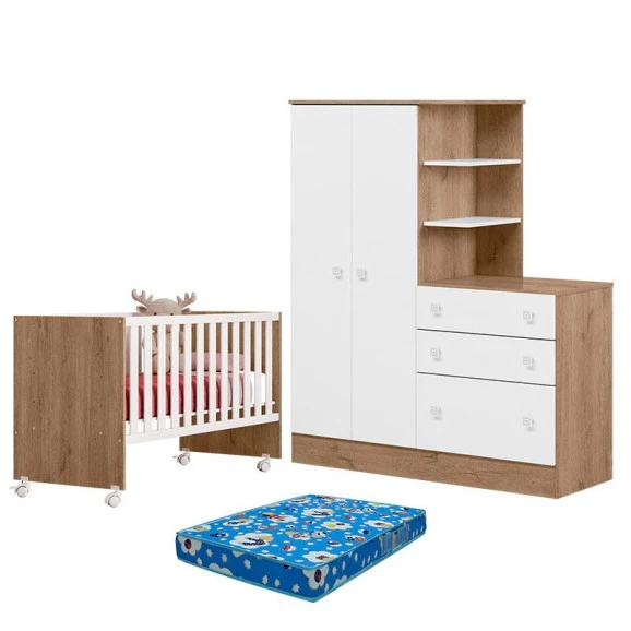 Berço Nacional 3540 e Guarda Roupa com Cômoda 4070 Doce Sonho Carvalho Rústico TOQ Branco e Colchão Tendtudo – Qmovi