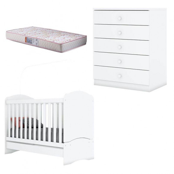 Berço Nacional Bala de Menta e Cômoda Infantil Pique-Esconde Branco com Colchão Gazin – Henn