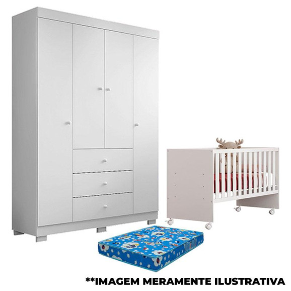 Berço Nacional Doce Sonho 3540 e Guarda Roupa Duda 4 Portas Branco Brilho com Colchão – Phoenix Baby