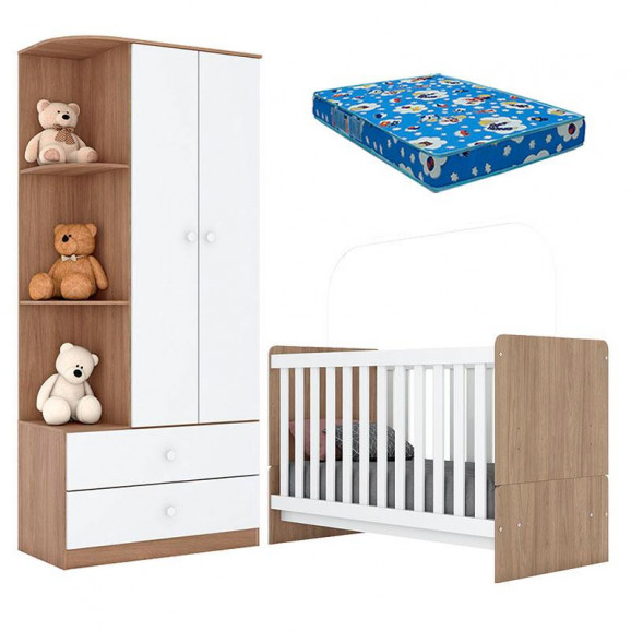 Berço Nacional e Guarda Roupa Infantil Labirinto Rústico Branco com Colchão Ortobom - Henn