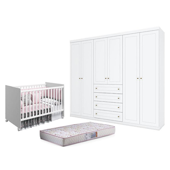 Berço Nacional Mel Branco Acetinado – Reller e Guarda Roupa Casal Americano 6 Portas Branco HP com Colchão Gazin – Henn