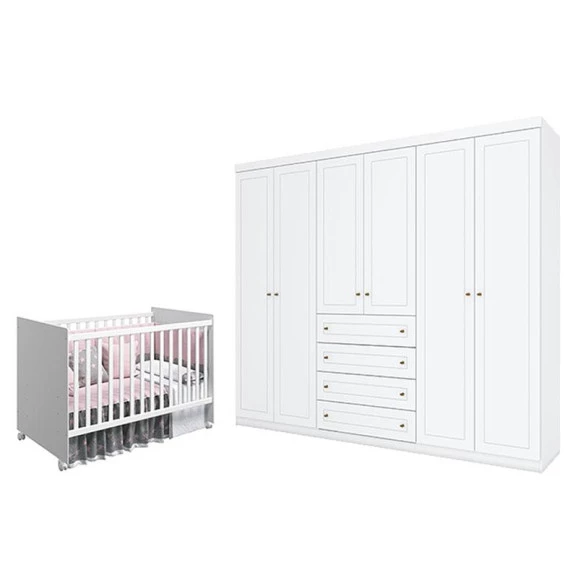 Berço Nacional Mel Branco Acetinado – Reller e Guarda Roupa Casal Americano 6 Portas Branco HP – Henn