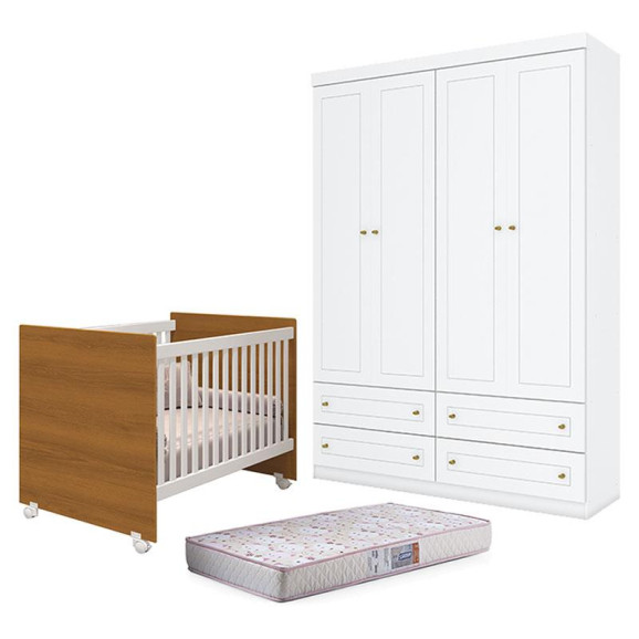 Berço Nacional Mel Branco Savana – Reller e Guarda Roupa Infantil Americano 4 Portas Branco HP com Colchão Gazin – Henn