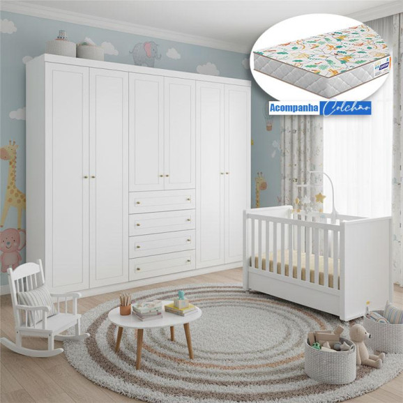 Berço Tutto New com Guarda Roupa Americano Ambiente 6 Portas Branco Fosco e Colchão Gazin - Matic
