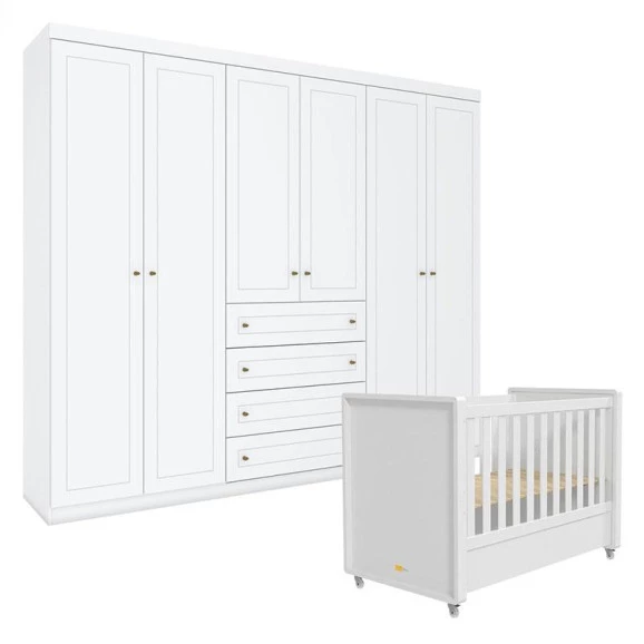 Berço Tutto New e Guarda Roupa Mississipi 6 Portas Branco Fosco - Matic