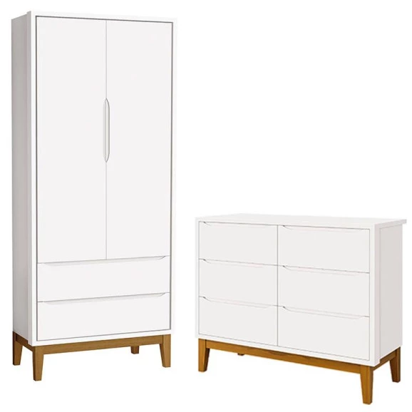 Cômoda 6 Gavetas e Guarda Roupa 2 Portas New Classic Branco com Pés Madeira - Reller