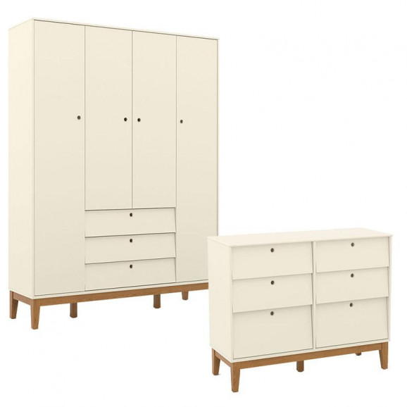 Cômoda 6 Gavetas e Guarda Roupa Unique 4 Portas Off White Eco Wood - Matic