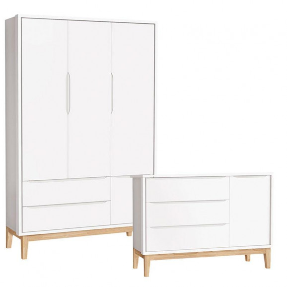 Cômoda com Porta e Guarda Roupa Infantil 3 Portas New Classic Branco com Pés Madeira Natural – Reller