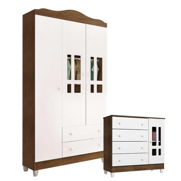 Cômoda e Guarda Roupa Infantil Ariel 3 Portas Branco Acetinado Amadeirado – Carolina