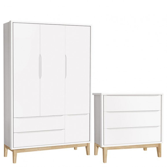 Cômoda Gaveteiro e Guarda Roupa Infantil 3 Portas New Classic Branco com Pés Madeira Natural - Reller