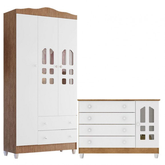 Cômoda Gran Selena e Guarda Roupa Infantil New Selena 3 Portas Branco Acetinado Amadeirado – Carolina