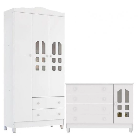 Cômoda Gran Selena e Guarda Roupa Infantil New Selena 3 Portas Branco Brilho – Carolina