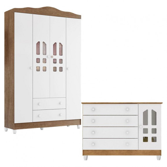 Cômoda Gran Selena e Guarda Roupa Infantil New Selena 4 Portas Branco Acetinado Amadeirado – Carolina Móveis