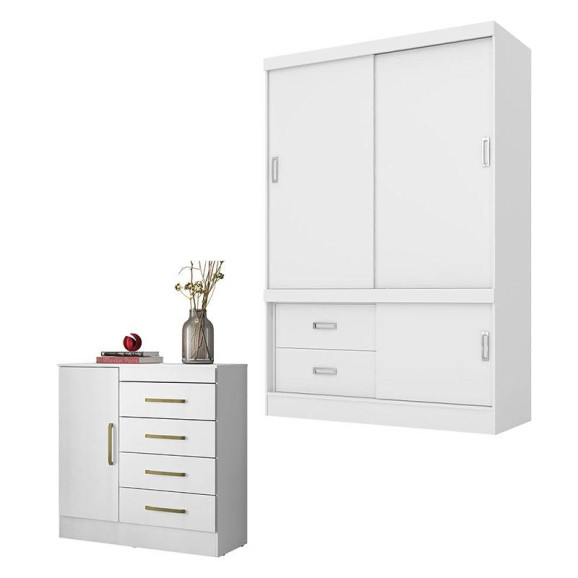 Cômoda Montevidéu e Guarda Roupa Solteiro Estilo 2 Branco Flex - Demóbile
