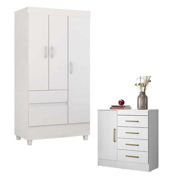 Cômoda Montevidéu e Guarda Roupa Solteiro Wind Branco Flex - Demóbile