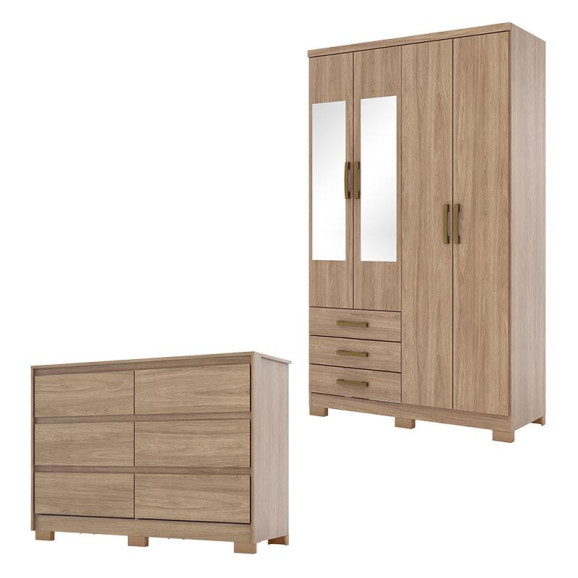 Cômoda Ravenna e Guarda Roupa Solteiro Caju 4 Portas Jequitibá Brilho com Espelho - Henn