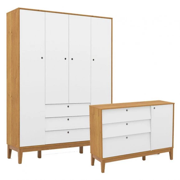Cômoda Sapateira e Guarda Roupa Unique 4 Portas Freijó Branco Eco Wood - Matic