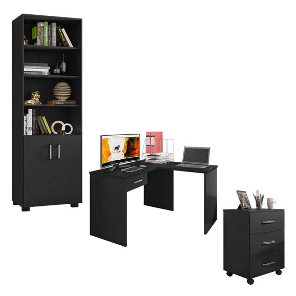 Conjunto para Escritório Gávea 1 Gaveta e Extensora com Gaveteiro Petrópolis e Livreiro Office com Portas Pequenas Preto Trama - Móveis Leão