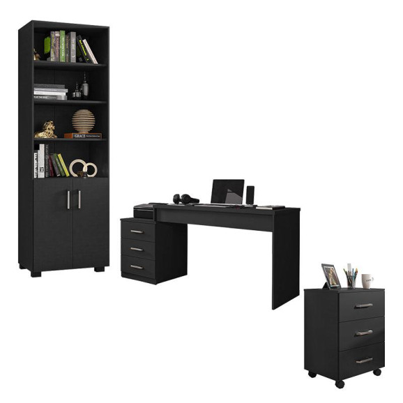 Conjunto para Escritório Petrópolis com Livreiro Office com Portas Pequenas Preto Trama - Móveis Leão