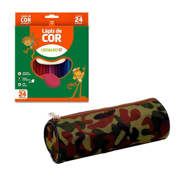 Estojo Escolar Redondo 717193 e Lápis de Cor Sextavado 4449 24 Cores - Leo&Leo