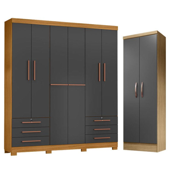 Guarda Roupa Casal Londres e Armário Multiuso New Egito Carvalho Americano Grafite - Incorplac