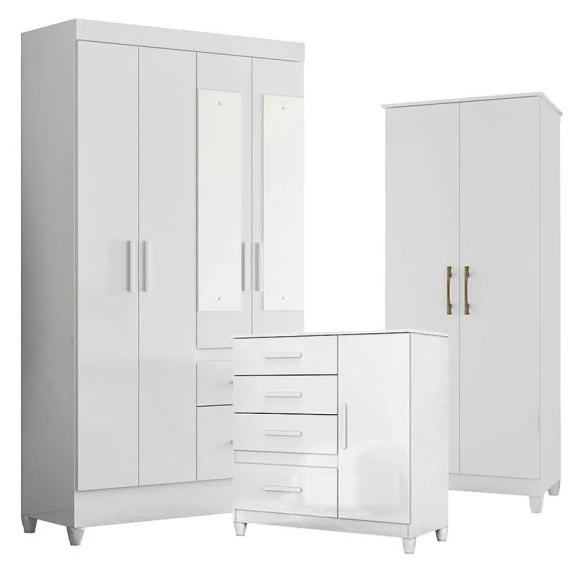 Guarda Roupa com Espelho Infantil Madri com Cômoda Vênus com pés e Multiuso Jade Branco Brilho – Moval