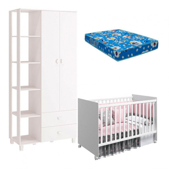 Guarda Roupa Gino 2 Portas e Berço Americano Tico Branco Acetinado com Colchão Ortobom – Reller