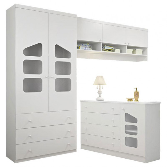 Guarda Roupa Infantil 2 Portas com Módulo Aéreo e Cômoda Eloisa Branco Brilho - Phoenix Baby