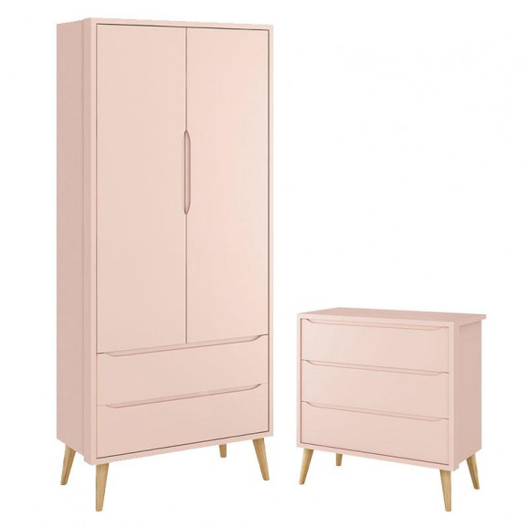 Guarda Roupa Infantil 2 Portas e Cômoda Gaveteiro Theo Rosa com Pés Madeira Natural – Reller