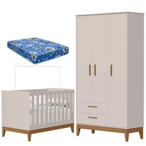 Guarda Roupa Infantil 3 Portas com Berço Americano Flip Areia Acetinado com Colchão Ortobom - Reller